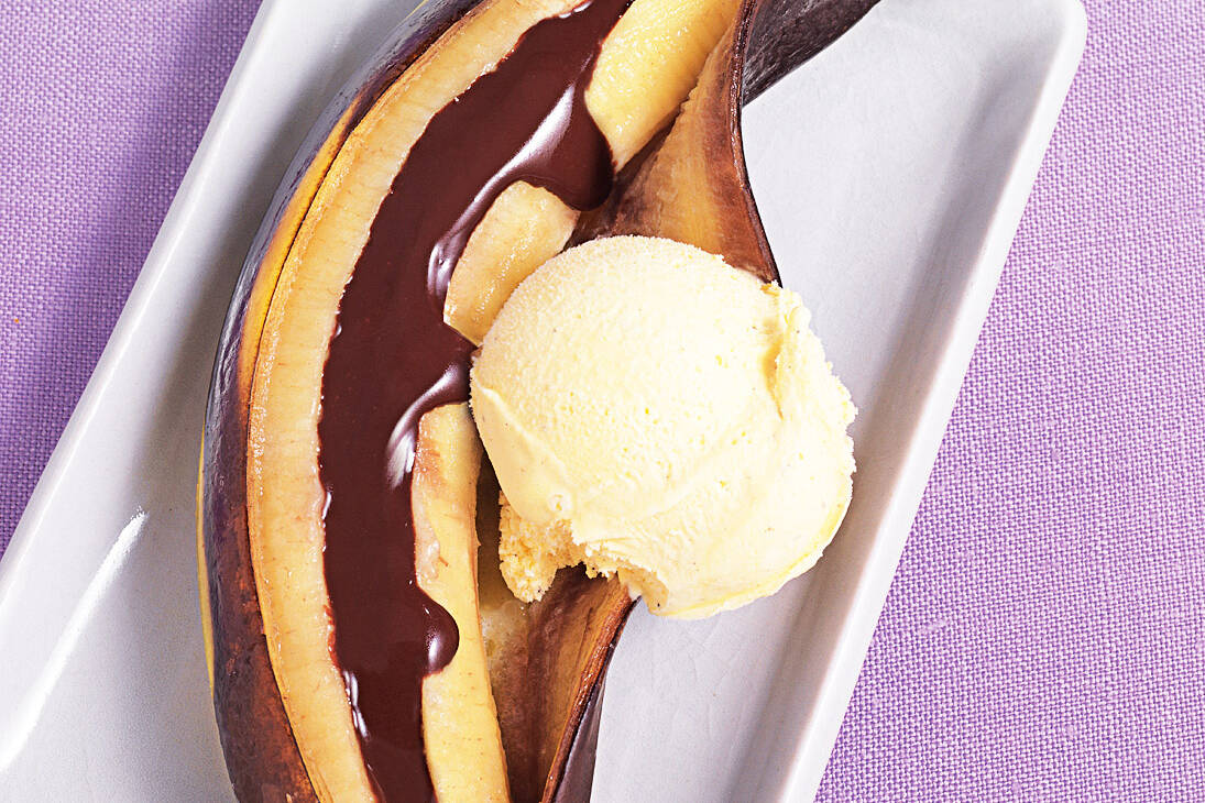 Bananen grillen schokolade. Vanille-Eis nach Belieben Kaufe hier die Zutaten. 4 Bananen à 125 g längs einschneiden und Schokolade in die Einschnitte stecken. Die Banane in die nicht mehr glühenden aber heißen Kohlen legen und warten bis die Schale schwarz wird.